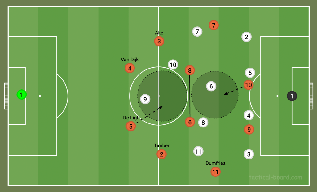 The primary fix here is the introduction of a back-four. The Netherlands have so many high-level defenders that they simply don’t need to play a back-three with wing-backs. We’ve seen a huge development in back-fours in the last six months, especially at Manchester City and Arsenal, where they’re now made up solely of robust one-v-one defenders. The uses of Dutchman Nathan Aké at left-back under Pep Guardiola and fellow international teammate Jurrien Timber at right-back for Arsenal this term can, and should, be utilised by Netherlands Ronald Koeman.