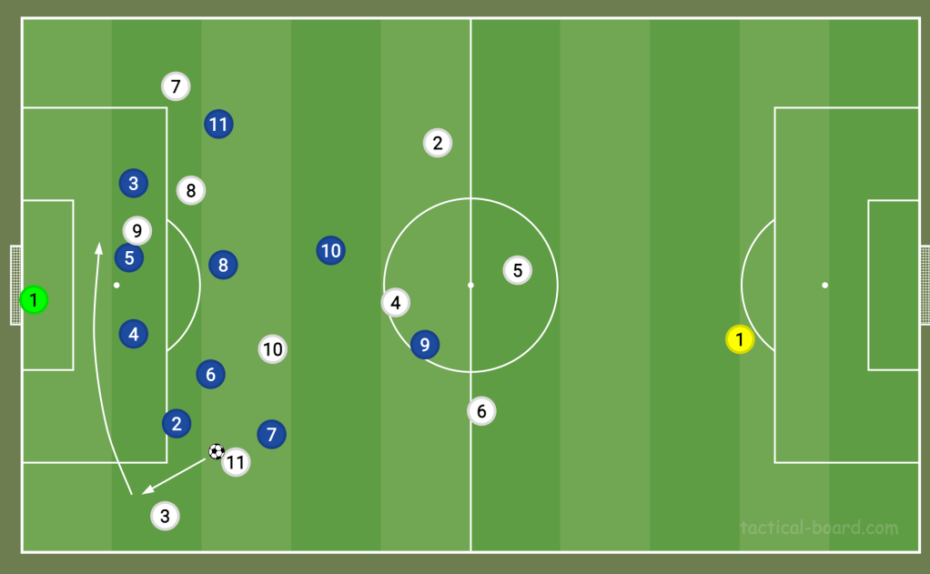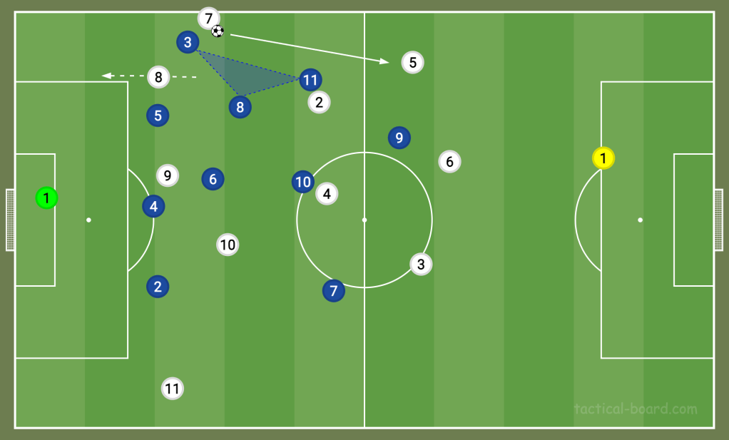 Another consequence of isolating the wingers so far wide is the loss of a partnership with the full-back. Notably, this is because the formation doesn’t incorporate traditional full-backs. This can be particularly frustrating for England because it means fewer crosses into the box for Harry Kane. In a 4-3-3, the link between a winger and full-back often leads to a crossing opportunity.