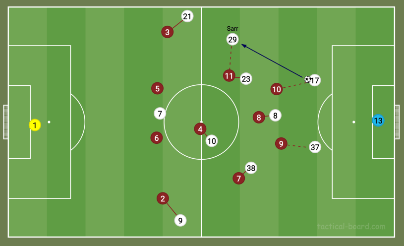 However, Sarr has been making the same movement all season in build-up. He wanders over to the right flank as a bridge for that centre-back-to-winger pass. Against these pressing teams, he causes a real problem, especially for the opposition left-winger (in this case, the No.11).