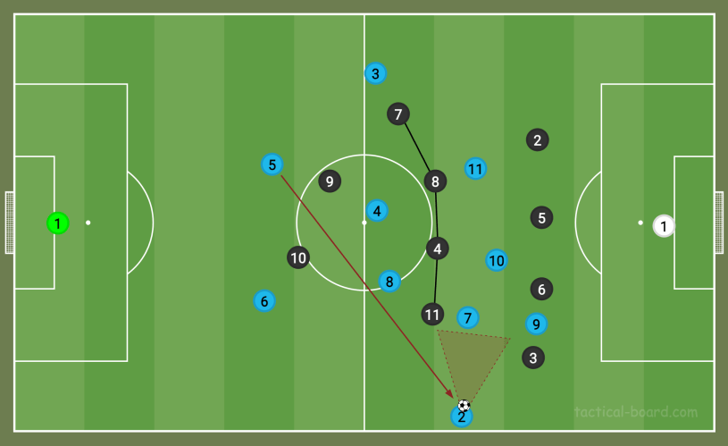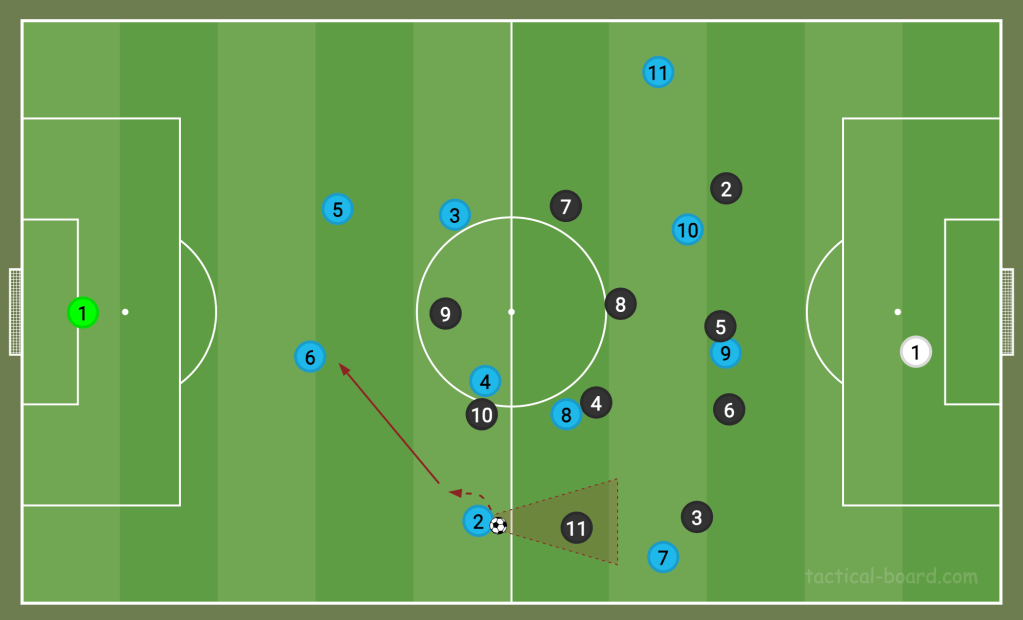 Secondly, as seen above, now standing on the touchline, his body shape differs when he receives the ball. Facing inwards gives him a broader vision to play to teammates inside, and he does not commit himself to a particular direction of play before playing the pass.