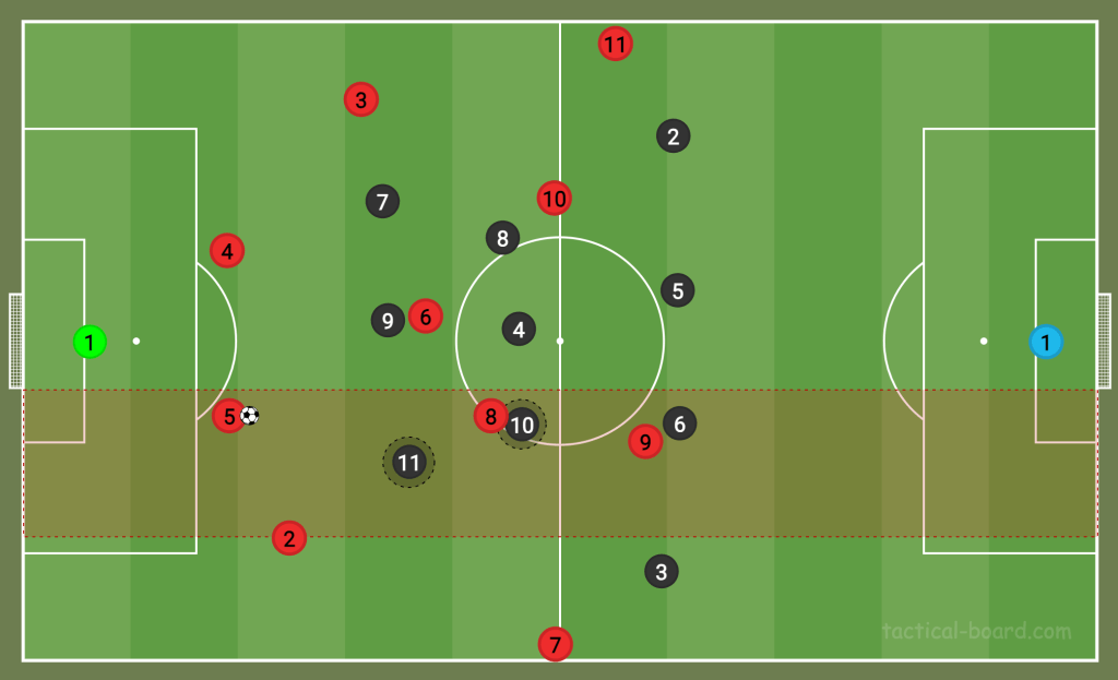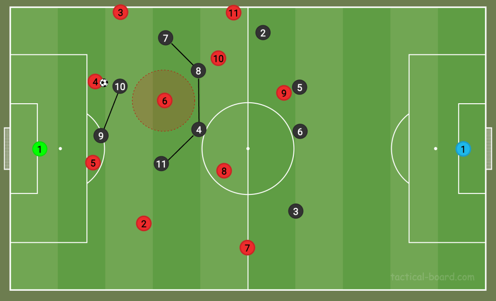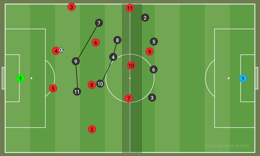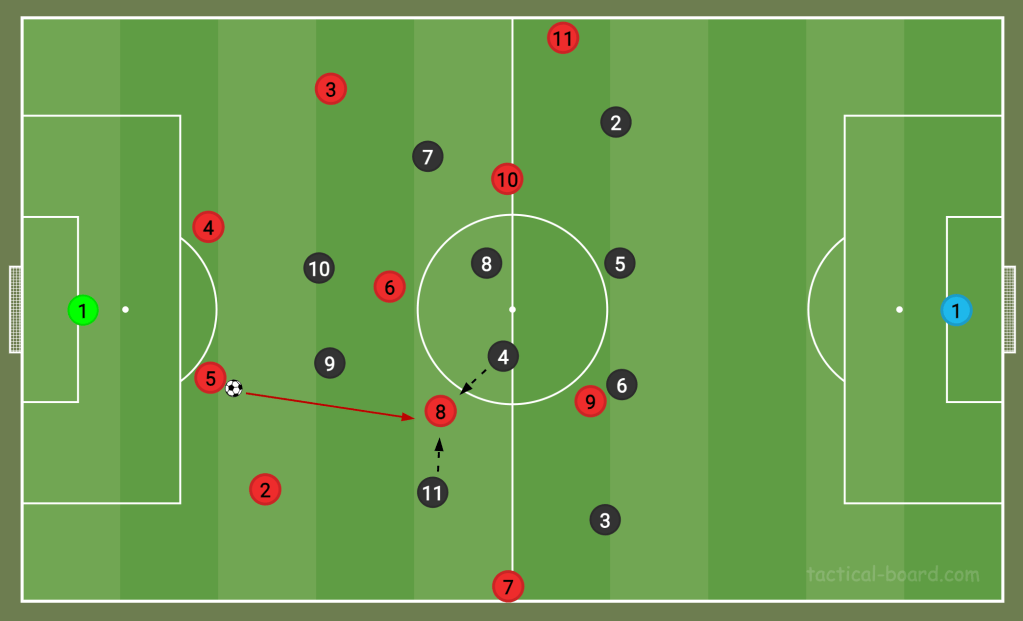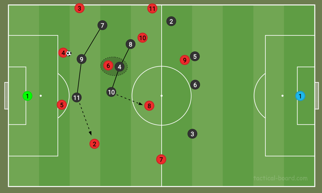 If the ball reaches the far side of the pitch, the winger can press the full-back (No.2), and the midfielder behind can drop deeper to track the No.8.