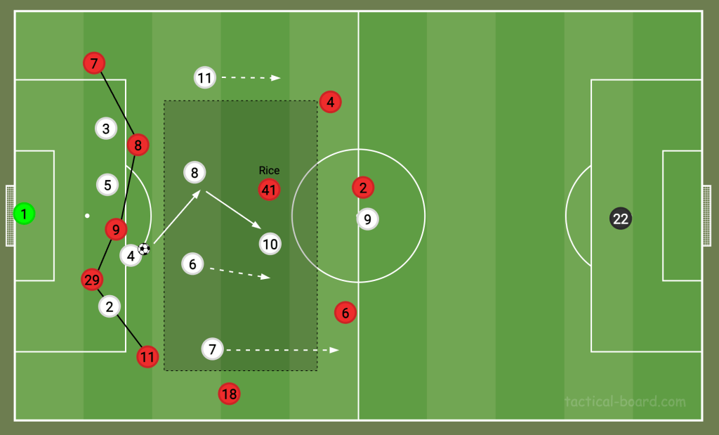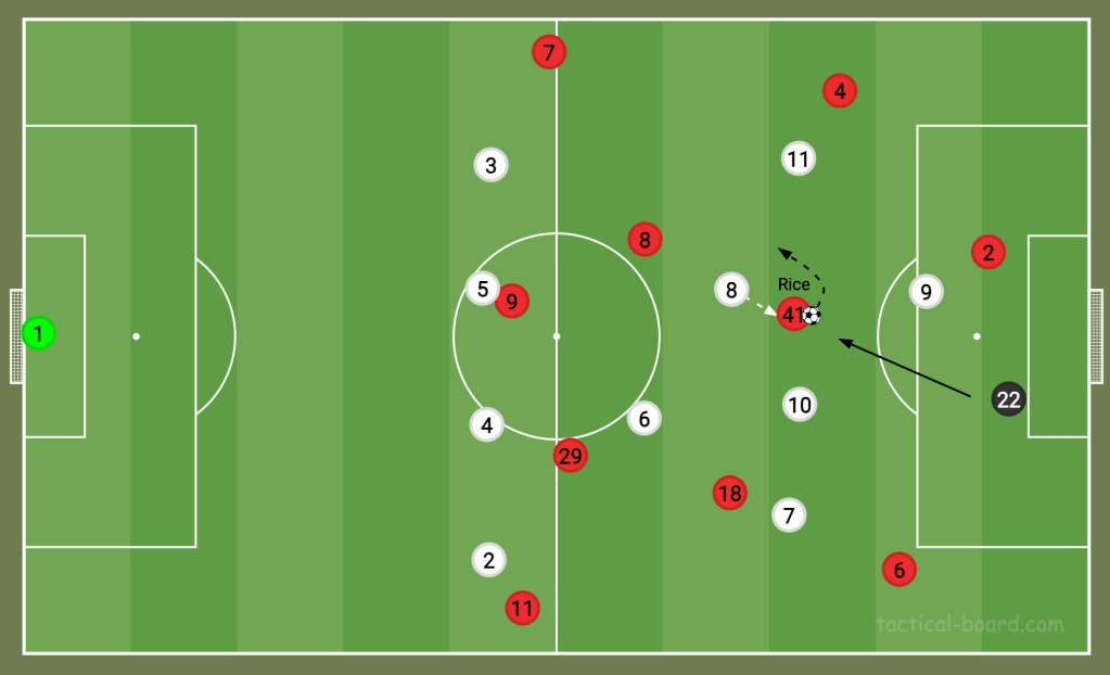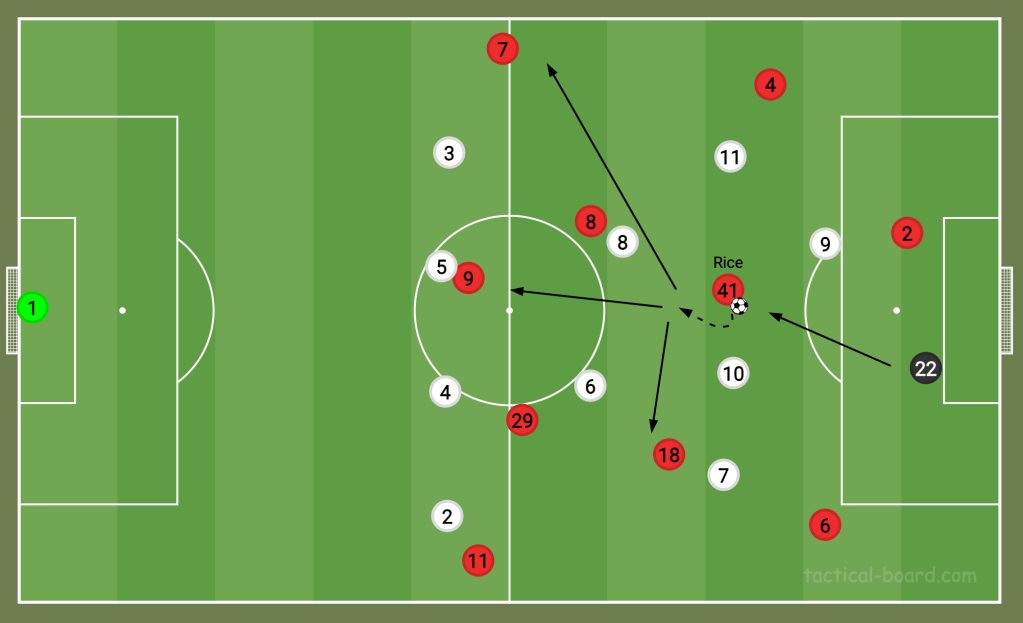 On the ball, one facet that makes Rice so accomplished is his adaptability to playing in different positions and situations. He has a great sense of surrounding, which is crucial for a pivot midfielder who will usually receive the ball with their back to the play. Rice knows when to set the ball back to a teammate and when to turn instead. Often described as ‘press resistant’, he’s not afraid to draw an opposition player towards him before beating them on the turn.