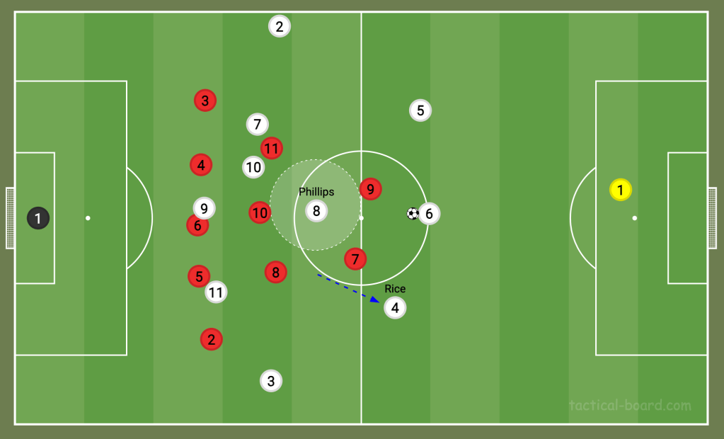 With Phillips in, Rice enjoys more freedom to roam where he pleases. Rice likes to pull into the left-half-space when Harry Maguire has the ball at centre-back, or sometimes drop in to make a back three if needed. Phillips is most comfortable in this central area, so Rice is allowed to read the game and adapt his positioning.