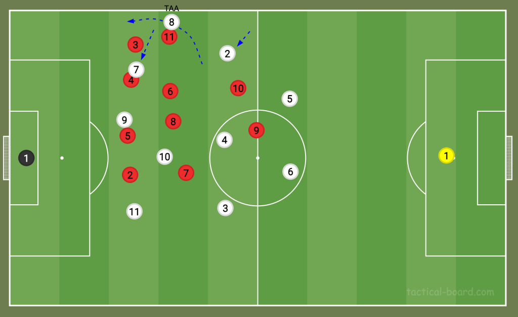 Similarly, Alexander-Arnold will still be free to pull wide and overlap Saka to cause overloads, as we saw a lot against Australia in October. This is what Jordan Henderson did really well to confuse the French in the World Cup quarter-final.